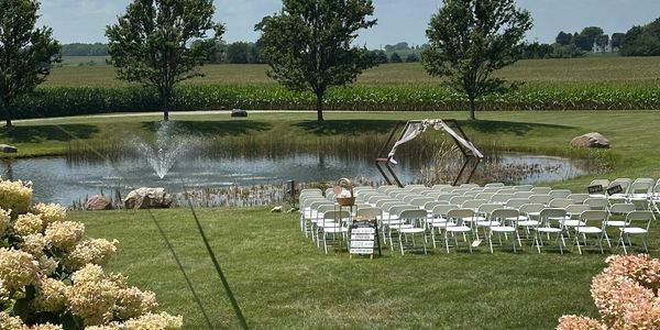 Our stunning wedding venue sits on 20 acres of land boasting picturesque greenery, a pond, and a grand 54' X 72' building with double doors that open on each side, providing an indoor setting with an outdoor feel. With indoor and outdoor ceremony options, you can say 'I do" in a setting that perfectly reflects your style and personality.